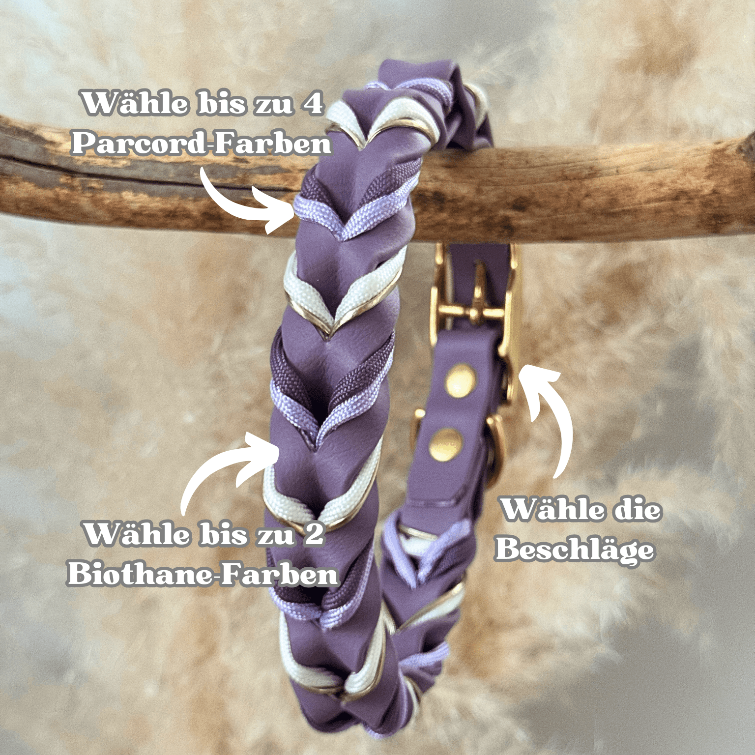 Erstelle dir ein Unikat! Per Hand geflochten besteht dieses Halsband aus hochfestem Biothane und Paracord zwei robuste und strapazierfähige Materialien, welche nicht nur für ihre Zuverlässigkeit bekannt sind, sondern auch für ihre Vielseitigkeit.